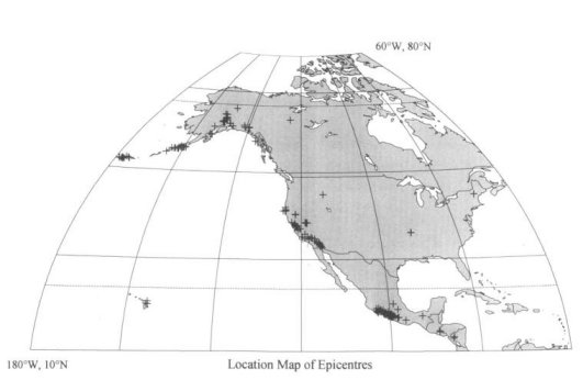 Based on the 1933 to 1986 data set provided by the U.S. Geological Survey in 1992, we investigated digitized strong-motion accelerograms from more than 200 earthquakes in North- and Central America (Fig. 1) to find out, whether their initial portions reflect the size of the ongoing earthquake. Applying conventional methods of time series analyses we calculated various signal parameters, the peak acceleration, the predominant frequency and the related Fourier amplitude, from the first second of each accelerogram and describe their variability in relation to epicentral distance, magnitude and peak acceleration.