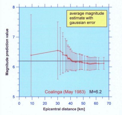 Fig. 2: The average magnitude prediction value as a function of the number of available accelerograms arranged with increasing epicentral distance. The magnitude of the Coalinga earthquake (ML=6.2) is indicated by a straight black line. The first analysed accelerogram of the earthquake was recorded in an epicentral of nearly 10 km. The first second information and revealed a magnitude estimate of about 6.4 ±1.36. This error is reduced significantly by calculating an average magnitude estimate. Including the first second information of 8 accelerograms recorded within an epicentral distance of 37 km reveals a magnitude estimate of 6.4 ±0.5.